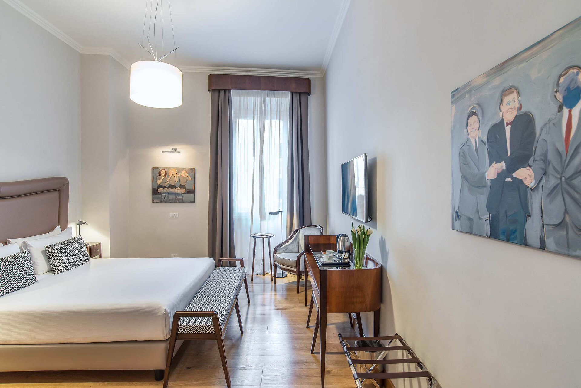 Las habitaciones Deluxe de Relais Rione Ponte disponen una cama King o dos camas individuales. El cuarto de baño es completo con amplia ducha, baño turco y cromoterapia. Las ventanas insonorizadas tienen vistas hacia Piazza delle Cinque Lune, Piazza di Tor Sanguigna, el Estadio de Domiciano o Via de' Coronari.